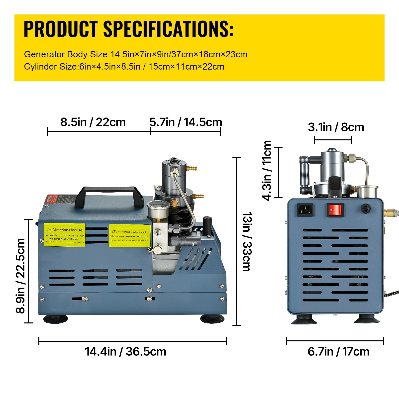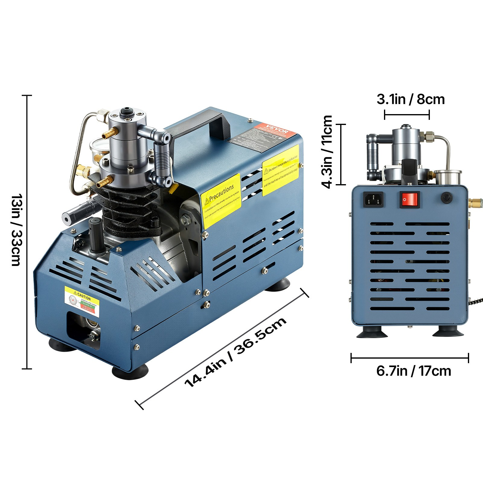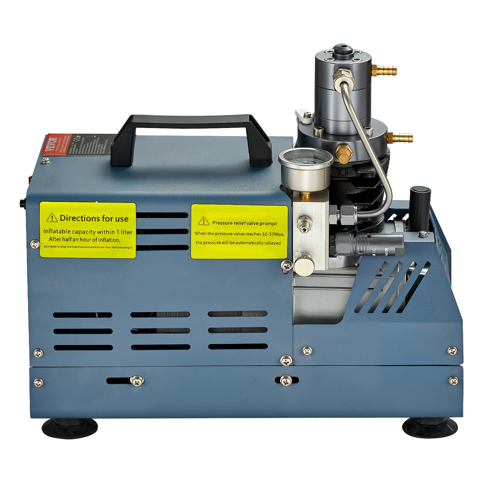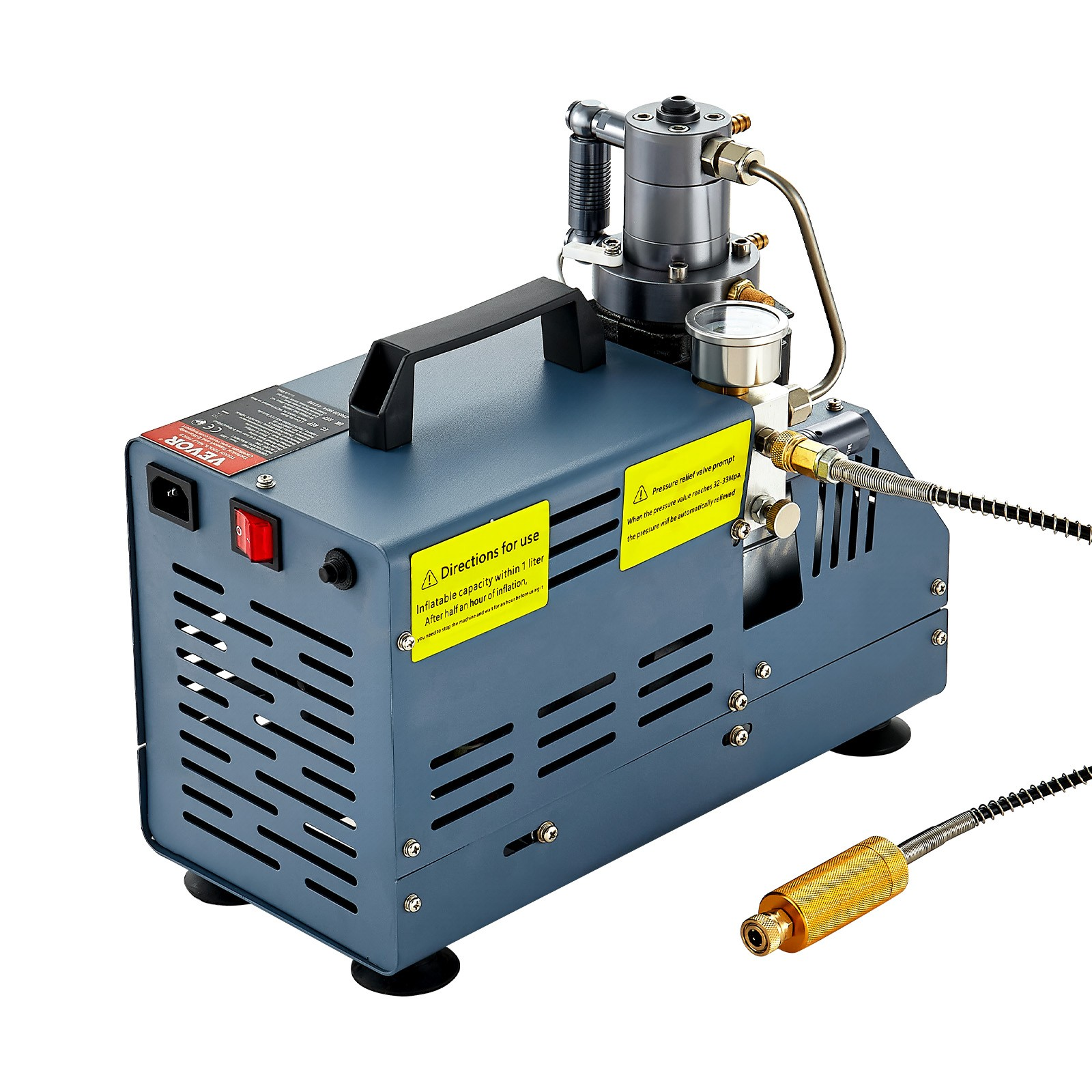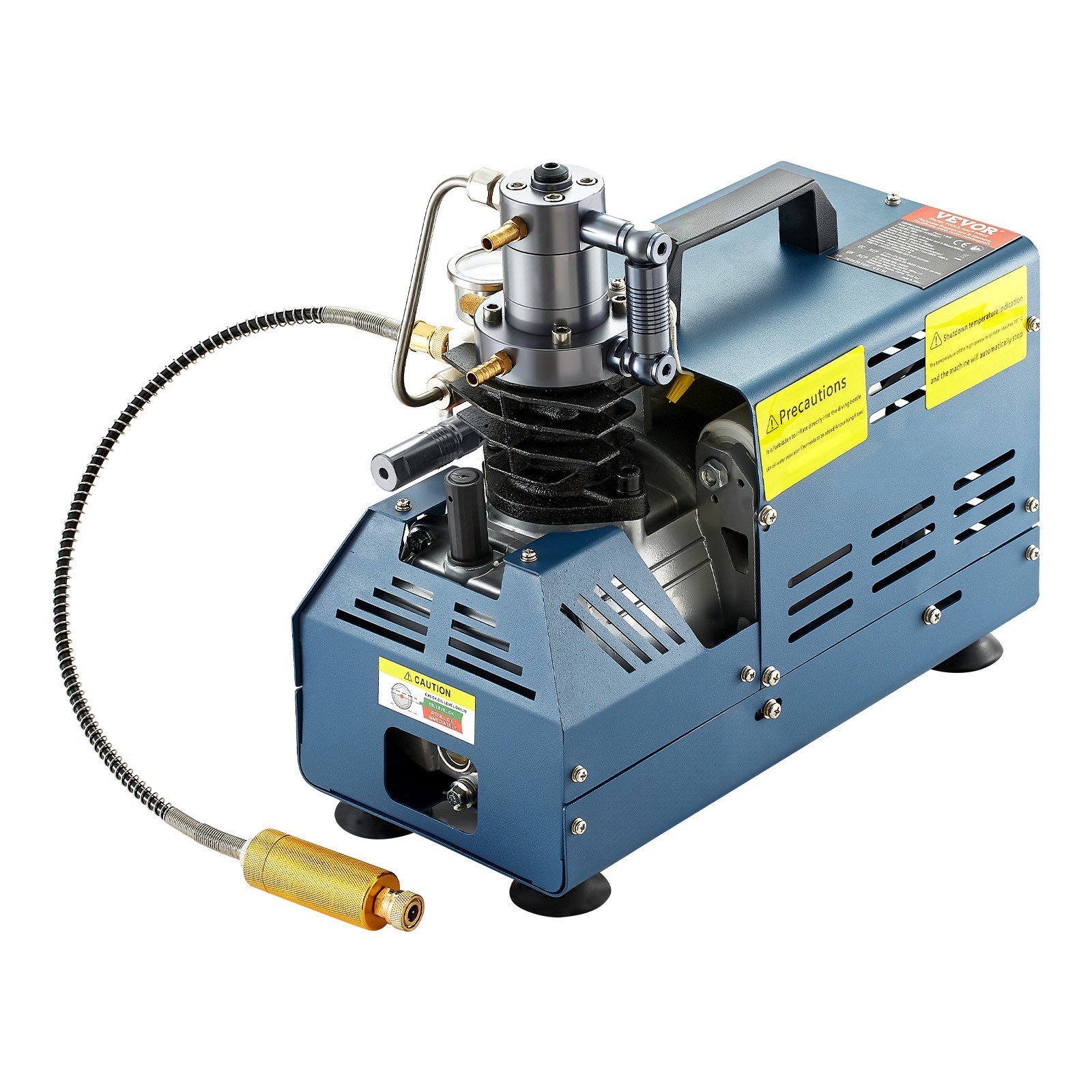 Dieser Kompressor für Tauchflaschen verfügt über einen leistungsstarken 1800-W-Motor aus Kupfer, der eine effiziente Befüllung ermöglicht. Er erreicht einen maximalen Arbeitsdruck von 4500 PSI, arbeitet mit einer Geschwindigkeit von 2800 U/min und bietet eine Förderleistung von 50 l/min.