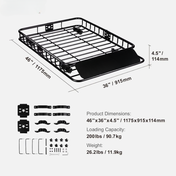 Der Universal Dachgepäckträger Korb mit den großzügigen Abmessungen von 1175 x 915 x 114 mm (46 x 36 x 4,5 Zoll) bietet Ihnen maximalen Stauraum auf dem Dach Ihres Fahrzeugs. Mit einer beeindruckenden Tragfähigkeit von 90 kg (200 lbs) – 33% mehr als der Marktdurchschnitt – transportieren Sie problemlos Campingausrüstung, Gepäck, Sportgeräte und sperrige Ladung.