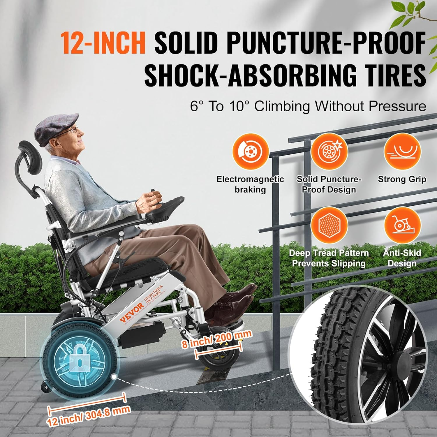 Die 12 Zoll Vollreifen (hinten) und 8 Zoll Vorderräder mit tiefem Profilmuster bewältigen verschiedene Untergründe – von Asphalt über Kopfsteinpflaster bis zu Steigungen von 6° bis 10°. Faltbar mit Knopfdruck für einfachen Transport und platzsparende Aufbewahrung. Perfekt für Senioren, Menschen mit eingeschränkter Mobilität und alle, die unabhängig bleiben möchten! 💎 🏆