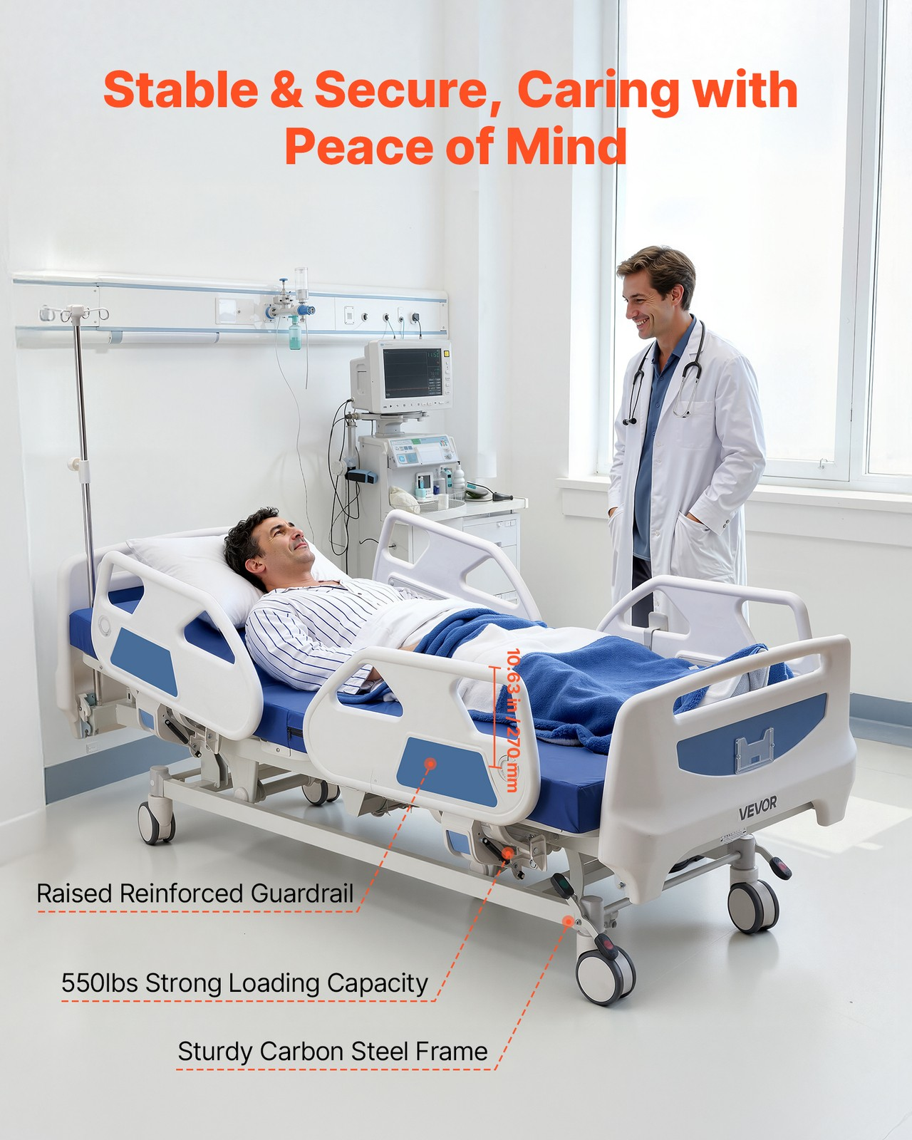 Dieses vollelektrische 5-Funktionen-Pflegebett vereint alle pflegerelevanten Verstellfunktionen in einem Bett, das sich gleichermaßen für die häusliche Pflege, das Altenheim und den Krankenhauseinsatz eignet. Der hochwertige leise Motorantrieb ermöglicht sanfte, ruckfreie Positionsänderungen per Handfernbedienung – Pflegekräfte müssen keine körperliche Kraft aufwenden, und Patienten können viele Anpassungen selbst vornehmen. 🏥 Die Höhenverstellung von 470 bis 760 mm ermöglicht eine ergonomische Arbeitshöhe für Pflegekräfte sowie eine niedrige Ausstiegsposition zur Sturzprophylaxe.