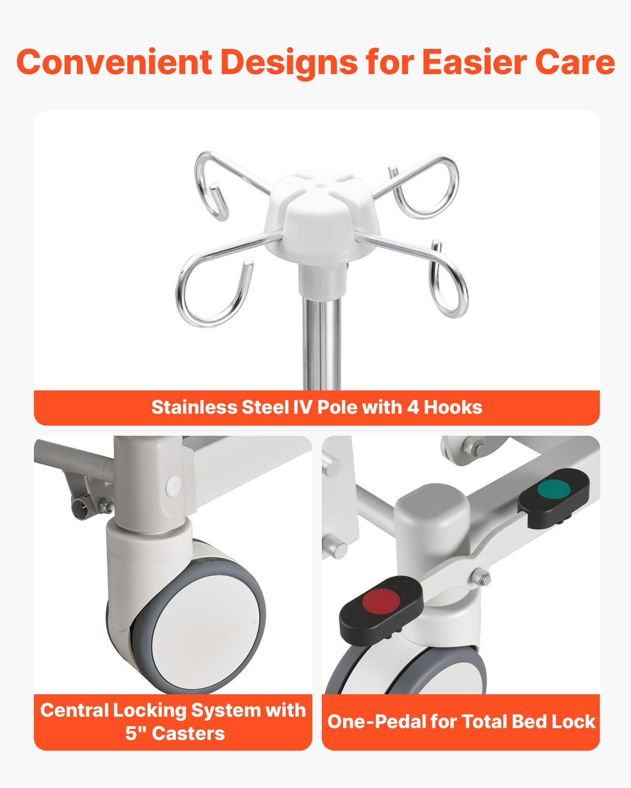 Ausgestattet mit einem zentralen Verriegelungssystem mit 12,7 cm (5 Zoll) Rollen und integrierten Bremspedalen, wodurch das gesamte Bett sicher verriegelt und entriegelt werden kann.