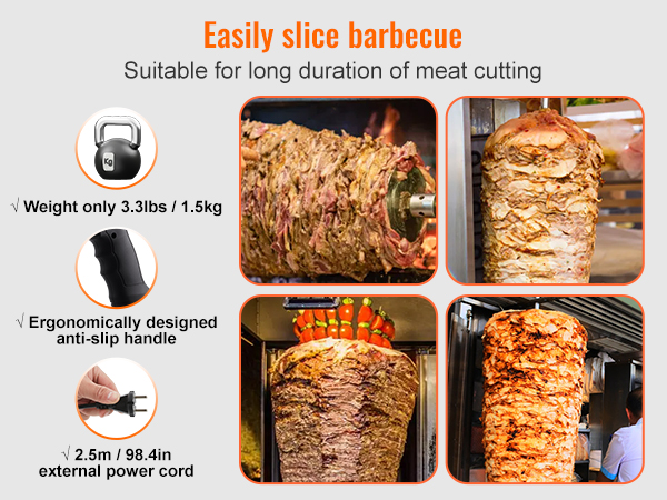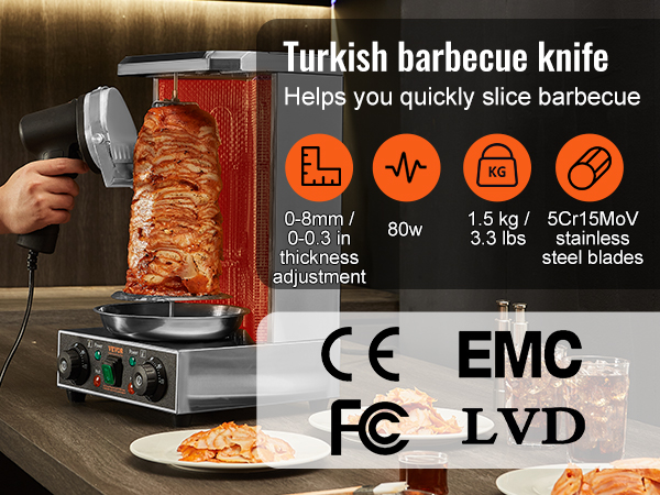Der 80-Watt-Motor garantiert ein kraftvolles, gleichmäßiges Schneiden. In Kombination mit den hochwertigen Klingen erhöht dieses Messer Ihre Arbeitsgeschwindigkeit deutlich und liefert saubere, gleichmäßige Scheiben – perfekt für Döner, Schawarma, Gyros oder Grillfleisch.