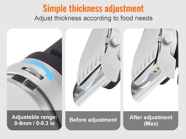 Mit dem verstellbaren Drehknopf auf der Oberseite können Sie die Schnittdicke präzise von 0 bis 8 mm einstellen. So erhalten Sie immer die perfekte Textur – egal, ob Sie hauchdünne oder dickere Fleischscheiben bevorzugen.