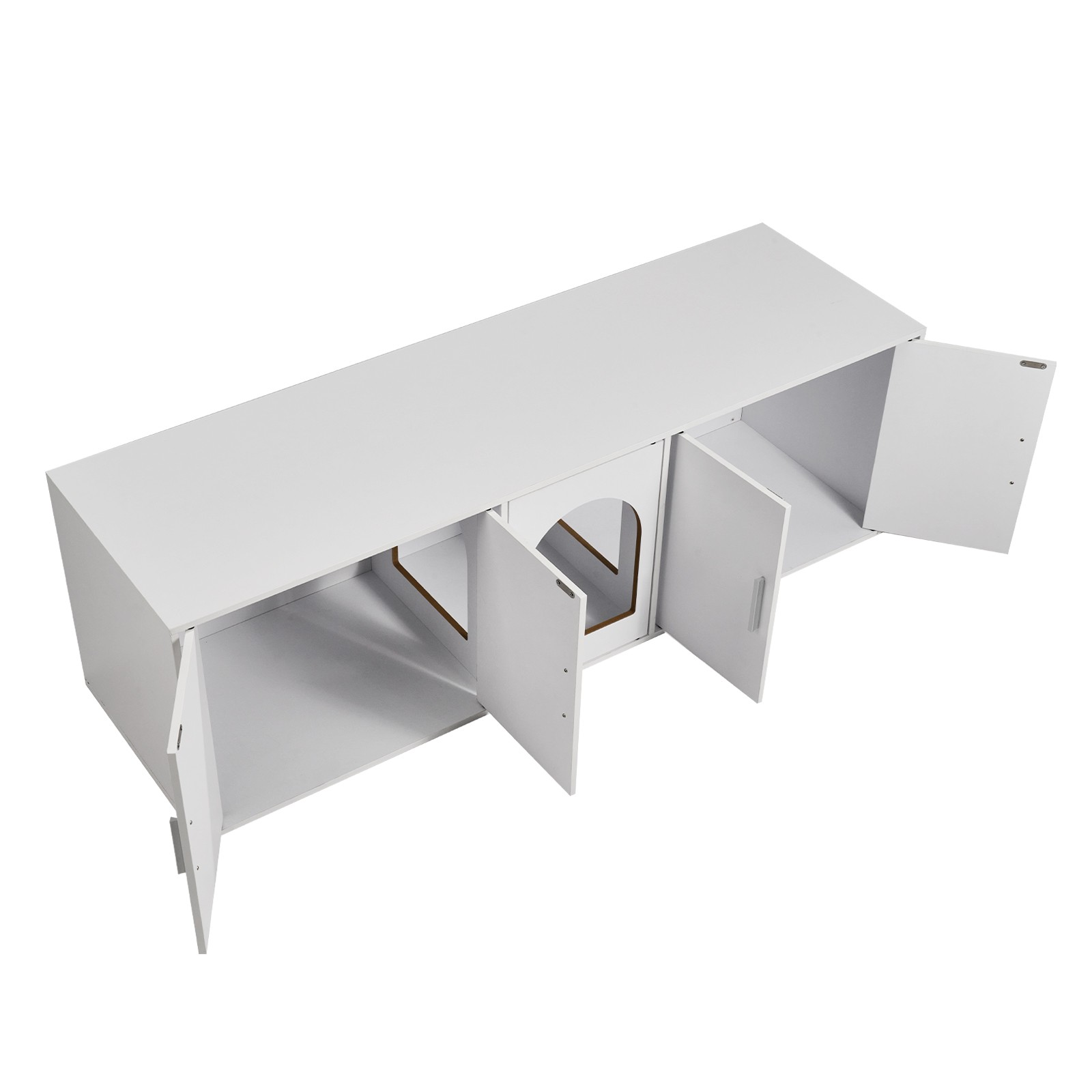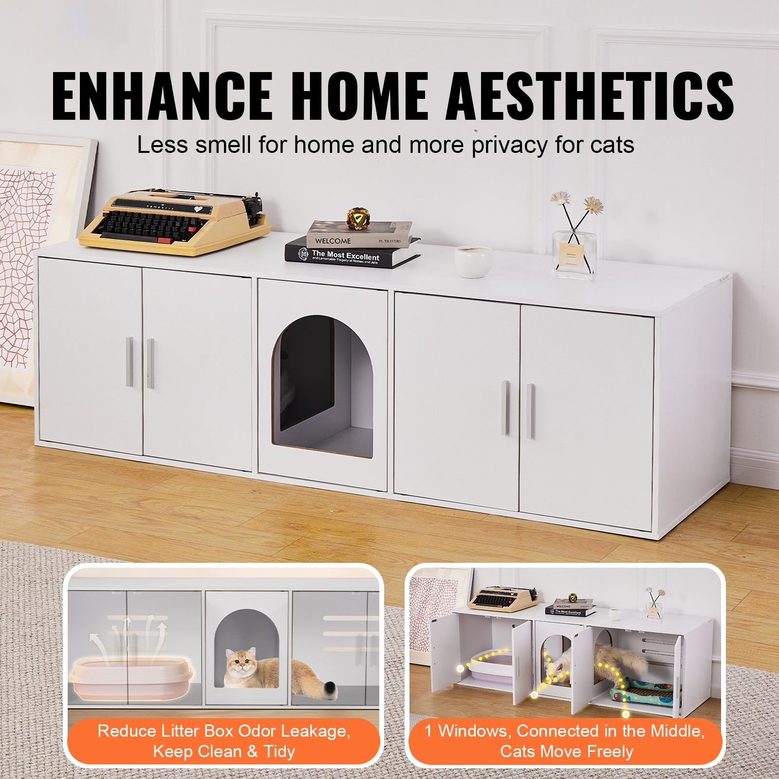- Geräumiger Platz: Mit den Maßen 57,9 x 18,3 x 17,9 Zoll / 1,47 x 0,46 x 0,45 m bietet dieses Katzentoilettenmöbel einen bequemen und freien Ruheplatz für Haustiere. Es bietet Platz für Katzentoiletten mit einer Länge von weniger als 21,9 Zoll / 56 cm und einer Breite von weniger als 17,7 Zoll / 45 cm. Es ist mit 5 Türen und einem Fenster ausgestattet, die zwei Schränke verbinden, damit Katzen freien Zugang haben.