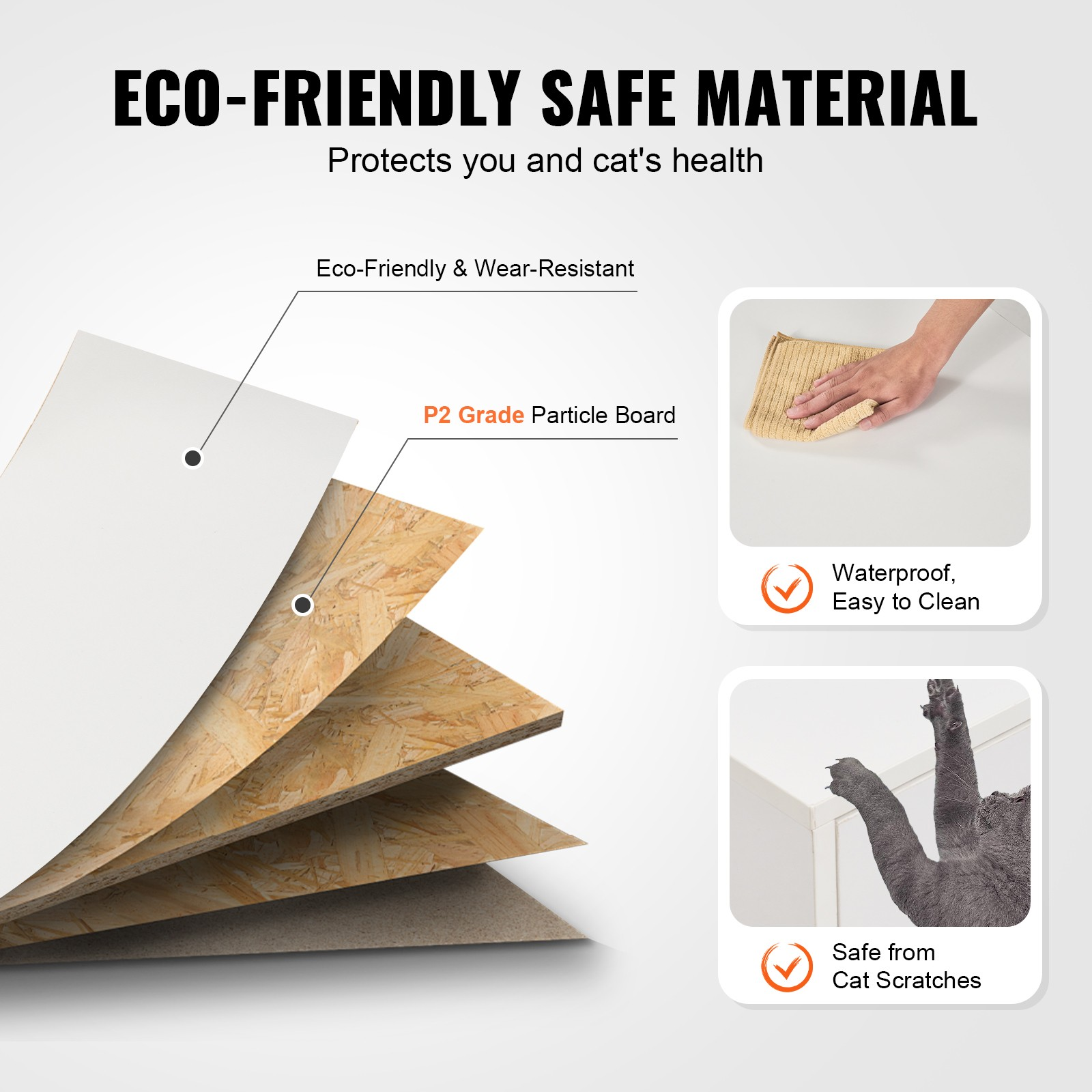 Es besteht aus Spanplatten der Güteklasse P2 und ist langlebig. Die hochwertige Oberfläche ist wasserdicht und kann durch Katzenkratzen nicht leicht beschädigt werden. Sogar Katzenurin oder andere Flecken lassen sich leicht abwischen.
