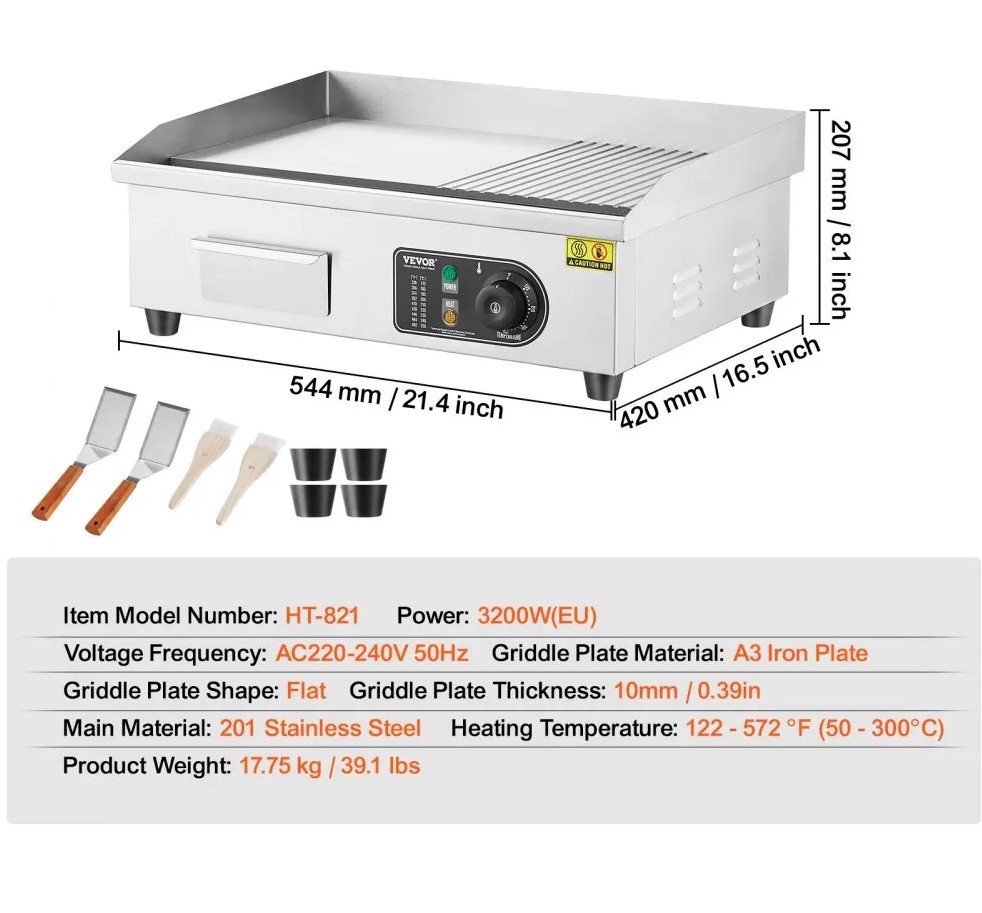 elektrischer Grill, Grillplatte elektrisch, professioneller Flachgrill, Elektrogrill Gastronomie, Edelstahl Grillplatte, 3200W Grill, Grill mit Temperaturregelung, Teppanyaki Grill, Elektrogrillplatte Gewerbe, Grillplatte 54×30 cm, Edelstahl Flachgrill, Gastronomie Elektrogrill