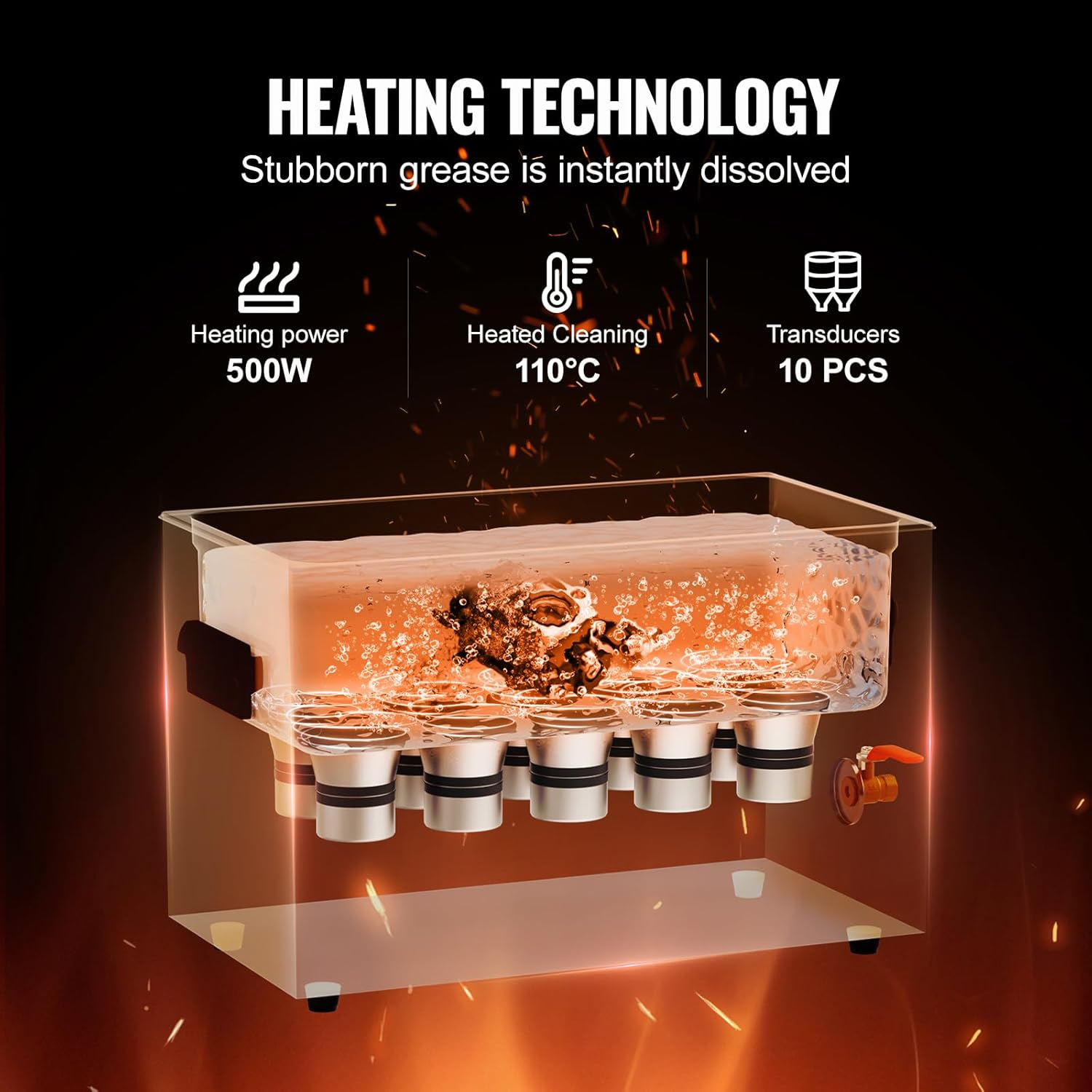 Die präzise regelbare Heizung mit 500W Leistung beschleunigt den Reinigungsprozess erheblich. Hohe Temperaturen lösen selbst hartnäckigste Fette und Öle, während niedrige Temperaturen empfindliche Materialien schonen. Perfekt für unterschiedlichste Reinigungsanforderungen.