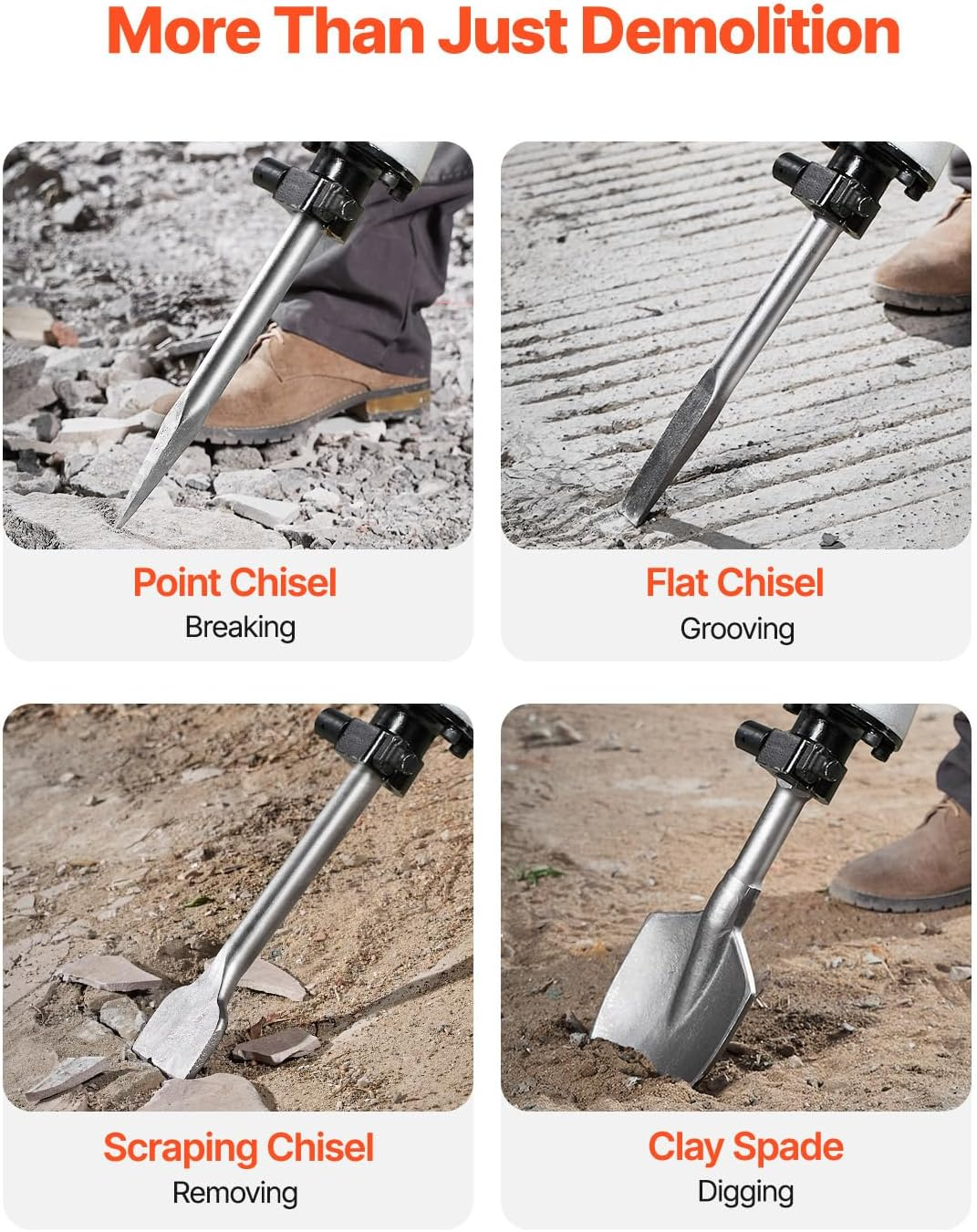 Das umfangreiche 4-teilige Meißel-Set macht diesen Abbruchhammer zum vielseitigen Werkzeug für jeden Einsatz: ⚡ Der Flachmeißel für großflächige Abbrucharbeiten, der Spitzmeißel zum präzisen Aufbrechen, der Lehmspaten für Grabenarbeiten und der Schabermeißel zum Entfernen von Fliesen und Putz. Das robuste Gehäuse aus Aluminiumlegierung ist einteilig geschmiedet und hält extremen Belastungen stand, während es gleichzeitig angenehm leicht bleibt.