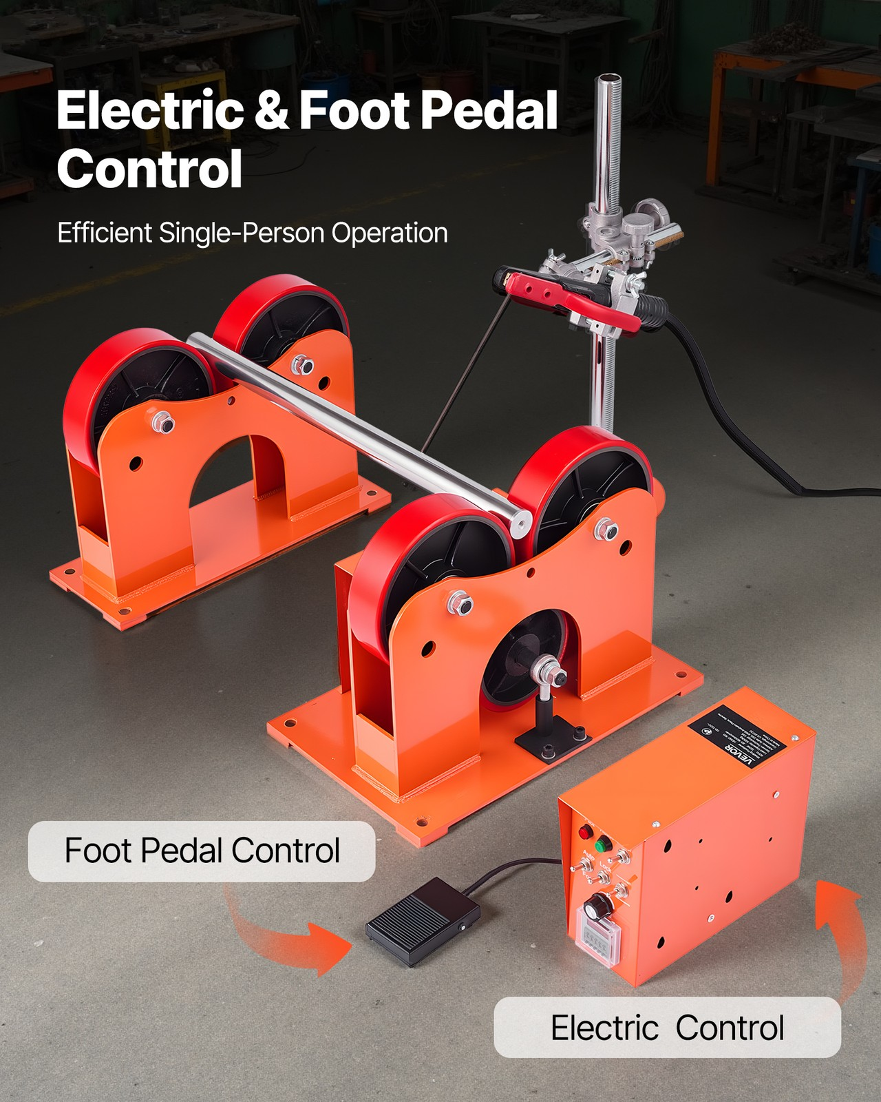 Die Schweißdrehwalze verfügt über ein Fußpedal für eine mühelose und bequeme Steuerung.