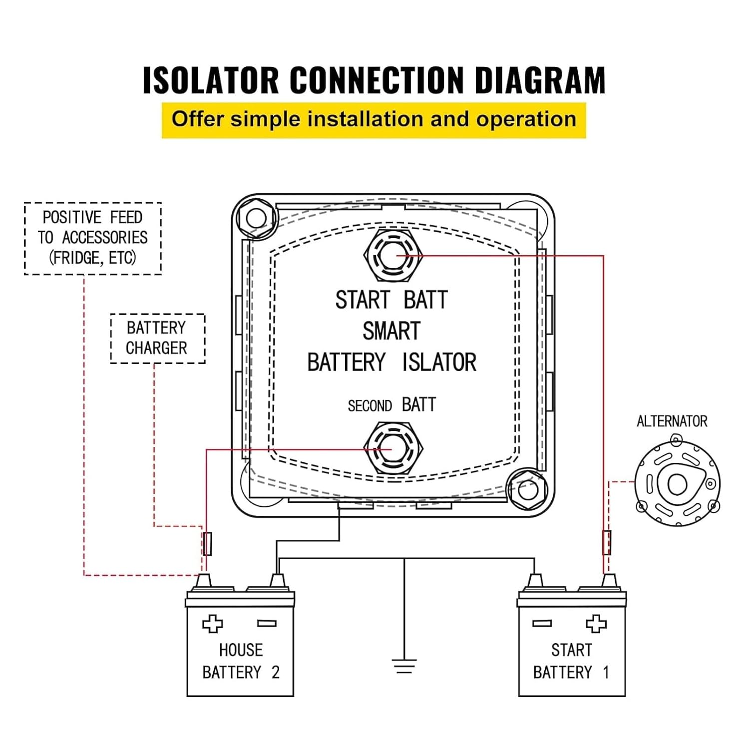 Das spannungsempfindliche Relais (VSR) schaltet automatisch bei 13,3 V ein und bei 12,8 V ab. Dadurch werden beide Batterien während der Fahrt geladen, aber beim Abstellen des Motors automatisch voneinander getrennt. So kann Ihre Zweitbatterie (z.B. für Kühlschrank, Licht, Radio) die Starterbatterie nicht entleeren – Ihr Fahrzeug bleibt immer startbereit!