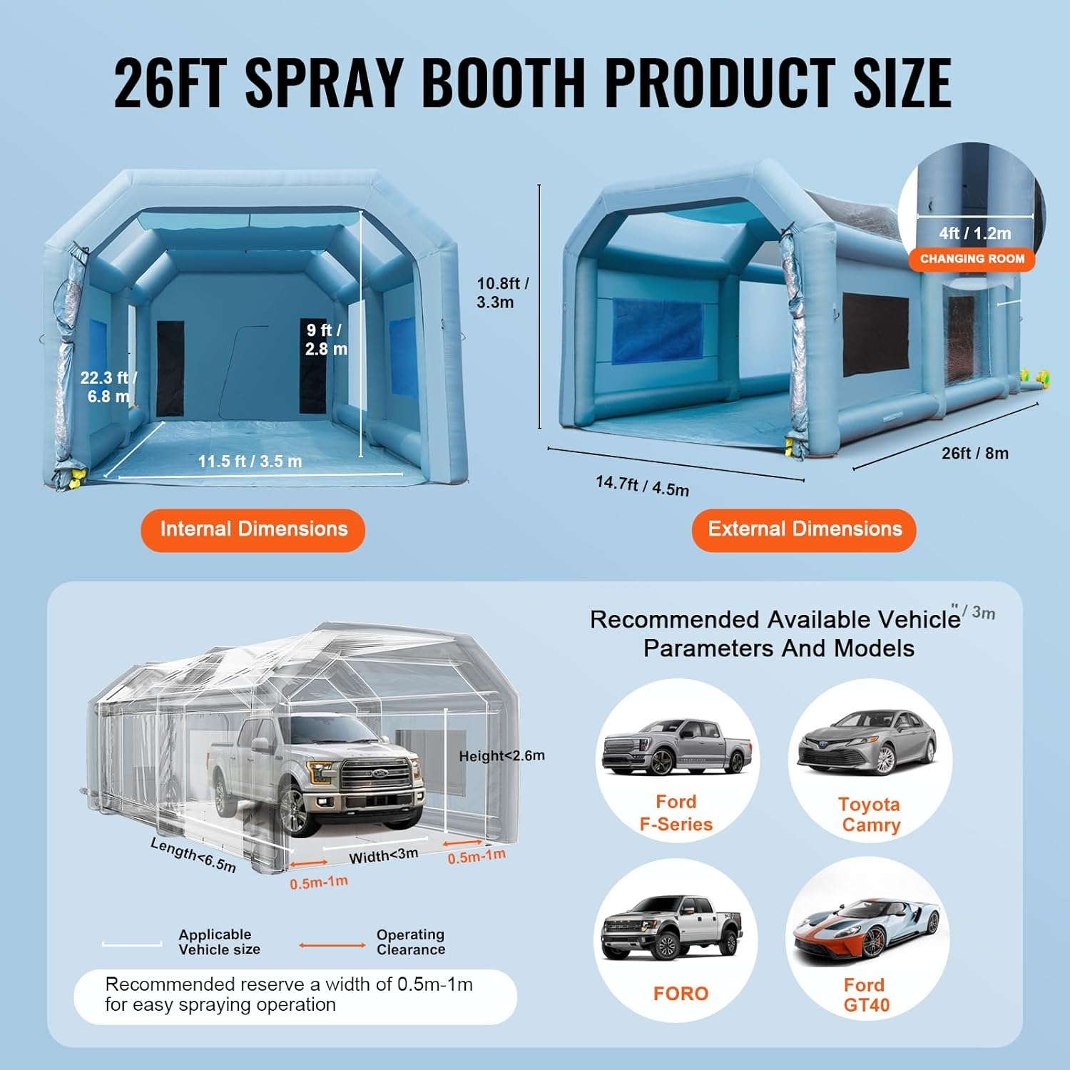 • Oxford-Gewebe & PVC: Die aufblasbare Lackierkabine von VEVOR ist eine Kombination aus verdicktem 201D Oxford-Gewebe mit PU-Beschichtung und 4 mm PVC-Material, das hervorragende Haltbarkeit und Schutz vor Schmutz bietet. Außenabmessungen: 8 x 4,5 x 3,3 m (26 x 14,7 x 10,8 Fuß); interner Arbeitsbereich: 6,8 x 3,5 x 2,8 m (22 x 11,48 x 9,18 Fuß); Isolierbereich: 1,2 x 3,5 x 2,8 m (3,93 x 11,48 x 9,18 Fuß).